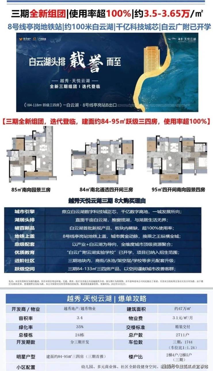 【越秀·天悦云湖】这个项目,该小区位于白云区白云湖数字科技城启动区,小区东北侧就是白云湖西湖,1期北门往东300米就是8号线亭岗地铁站A出口(实测),该项目主要卖点有:近地铁、金广附学区、紧邻白云湖无敌景观,产品方面属于偏舒适改善型为主,价格定位属于在白云湖版块最高,主要面向选择改片区预算较为宽松,偏改善自住型的中高净值人群