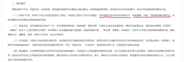 河北省2021年8月,河北省住建厅联合八部门启动持续整治规范房地产市场秩序专项行动,对房企违法违规开工建设,未按施工图开发建设,未按房屋买卖合同如期交付,存在房屋渗漏、开裂、空鼓质量问题,以及未按完整居住社区建设标准建设配套设施等违规行为进行专项打击。