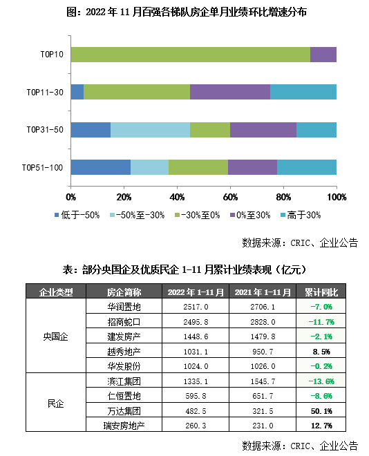 具体从企业表现来看,2022年11月百强房企中有近4成企业单月业绩环比增长,其中21家企业的环比增幅在0%至30%之间,19家企业环比增幅超过30%。TOP30房企表现优于行业整体,仅1家企业的单月业绩环比降幅高于50%,其余企业的环比降幅均在30%以内。其中,11月绿地、华发、中国铁建、万达、中粮大悦城的表现相对突出,单月业绩环比增幅均高于40%。整体来看,2022年行业格局变动加剧、规模房企表现分化明显,央国企及部分优质房企相对坚挺、表现出较强的抗周期韧性,如华润、建发、越秀、华发、滨江、仁恒等。