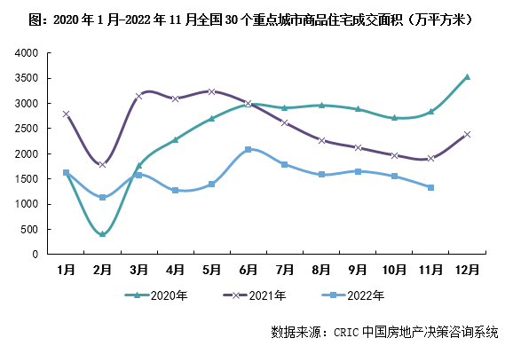 克而瑞认为,2022年11月,房地产市场继续探底,重点30城成交面积环比下降14%,创下半年来单月新低,同比跌幅扩至30%。且受限于国内疫情多点散发,不少城市市场陷入“半停摆”状态,重点30城供应面积同比跌幅近4成。