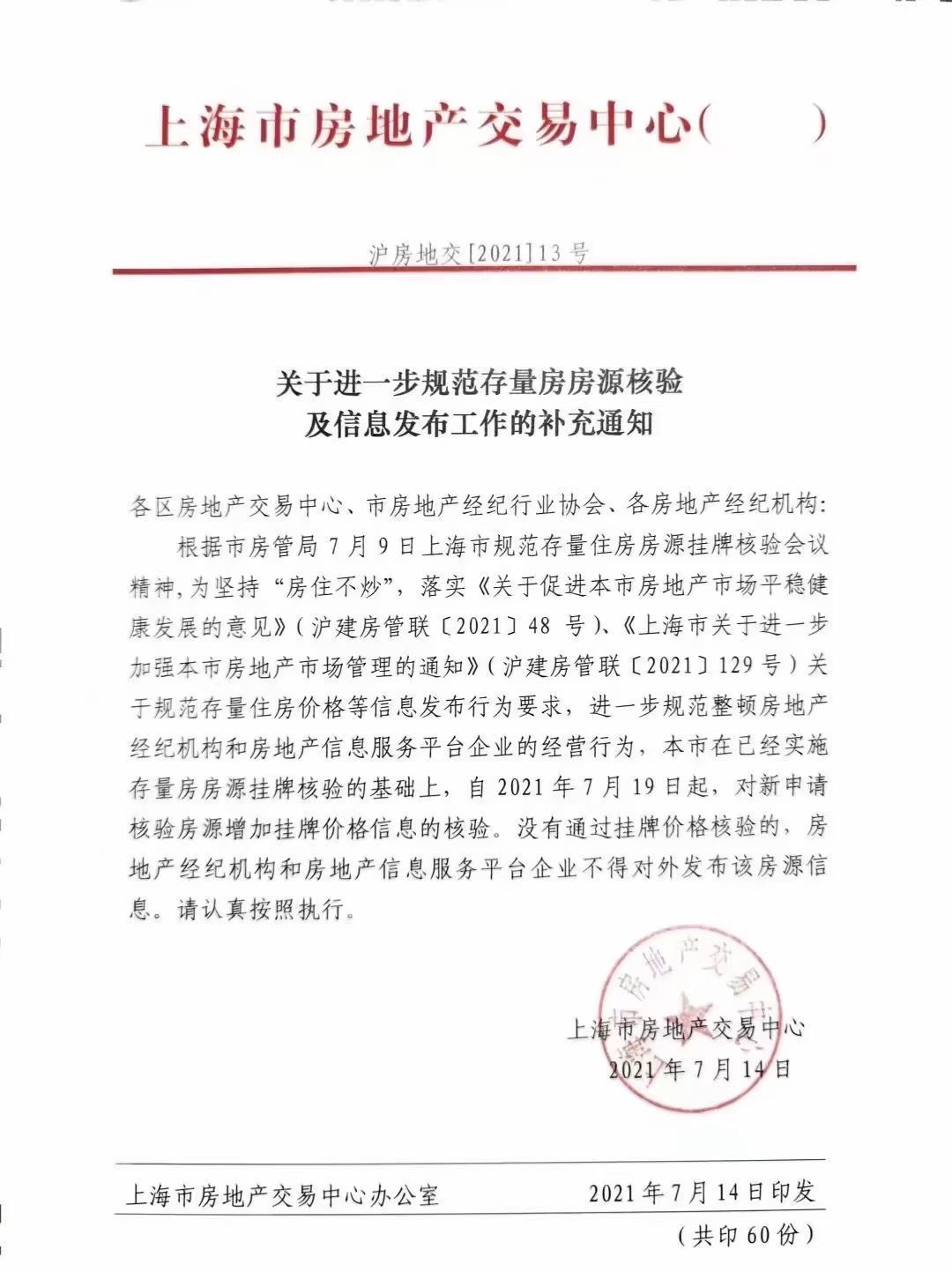 随之,7月12日,上海各中介开始对现有的所有挂牌二手房进行集中清理。按照要求,7月19日起,“网上房地产”价格核验系统将正式上线,开展挂牌核验业务。对新申请核验房源增加挂牌价格信息的核验,没有通过挂牌价核验的,房地产经纪机构和房地产信息服务平台企业不得对外发布该房源信息。