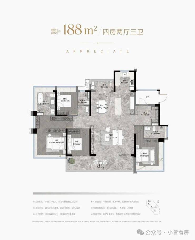 建面188平四房三卫,据说使用率超110%,双主套分居两侧,三代同堂的话,可以很好地避免两代人不同的休息时间干扰互相,入户独立玄关为还有宽裕的储蓄空间,能安置酒柜等,更有南北对流双阳台+中西双厨,主卧超宽三面采光等,不愧是终极改善不二之选,9米长跑道阳台,约34平豪华主卧,270度环幕飘窗