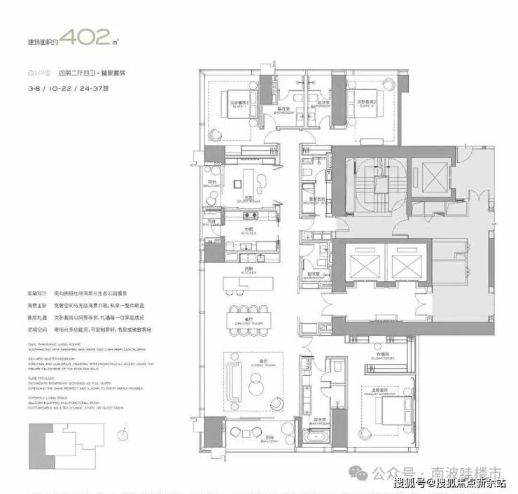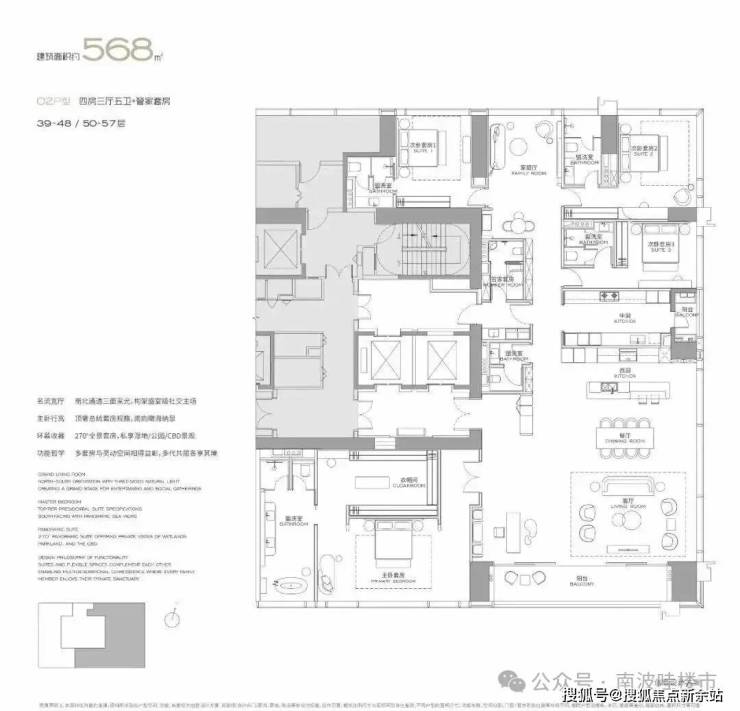 南北通透三面采光,顶奢总统套房规格,270°全景套房,享受湿地/公园/CBD景观,都是套房设计,更具私密性,中西厨分离。