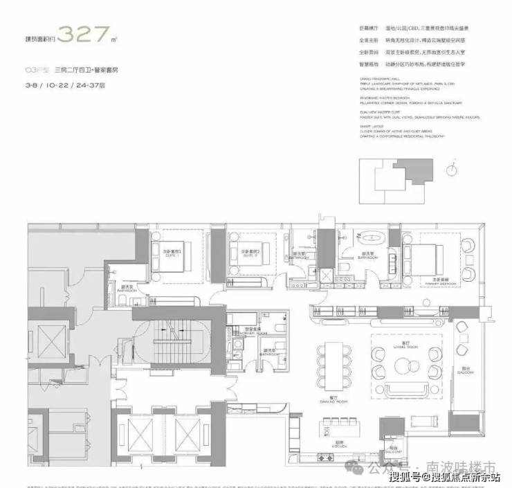 【户型规划】由4栋51至63层3.6-3.9米层高的纯居住奢装交付地标、两栋4.5米层高的小高层,35栋独栋,全景幕墙、宽景阳台。
