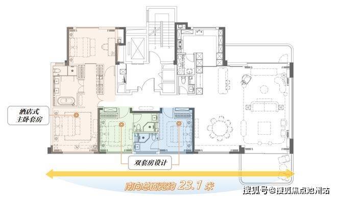 约23.1米南向面宽,做到了惊人的5开间。这一数据越大,意味着户型获得的采光面、视野面就越大,这也是北方人最为看重的。纵观青岛豪宅,鲜少能做到如此优秀面宽的。
