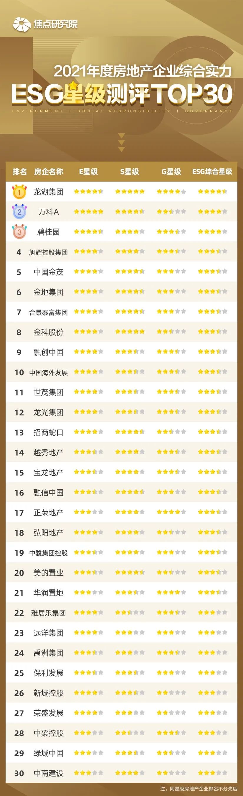 本测评为针对房地产企业2021年度ESG管理中的成果进行的综合星级测评。焦点研究院收集并整理了房地产企业官方网站信息、房地产企业公告及住房及城乡建设管理部门等政府部门数据,对环境资源维度(E)、社会责任维度(S)及公司治理维度(G)分别进行深入分析,最终形成2021年度房地产企业综合实力ESG星级测评TOP30榜单及三大维度榜单: