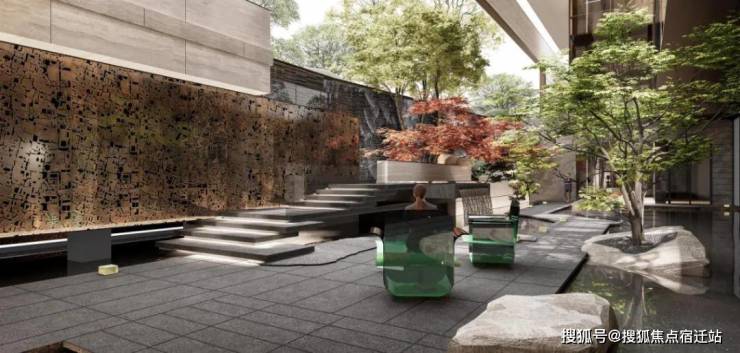 比如,大堂通往墅区的路径中引入了「雾森系统」,是在复现《村庄雨霁》诗句中的庭院深深烟雨朦胧的唯美意境。