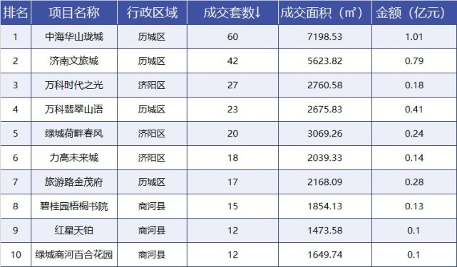 上周(2.15-2.21)中海华山珑城项目项目以网签60套、0.72万㎡,位居成交套数、成交面积、成交金额TOP10榜首。上周济阳、商河多项目集中网签。