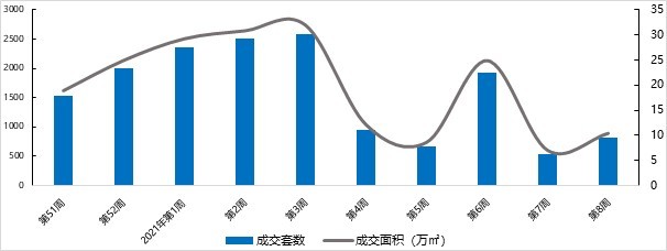 上周(2.15-2.21)商品住宅成交820套,环比增加50.46%;成交10.44万㎡,环比增加48.26%。节后网签量逐步回升。