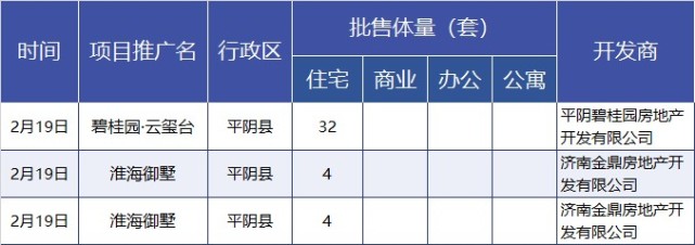 上周(2.15-2.21)济南市新增预售主要集中于平阴县,主要为碧桂园云玺台、淮海御墅等的住宅项目;无新增商业、办公、公寓项目预售。