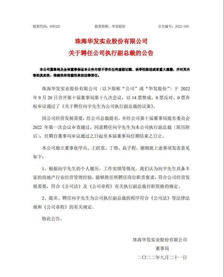 焦点财经讯 9月21日,华发股份发布人事变动公告,聘任向宇为公司执行副总裁。