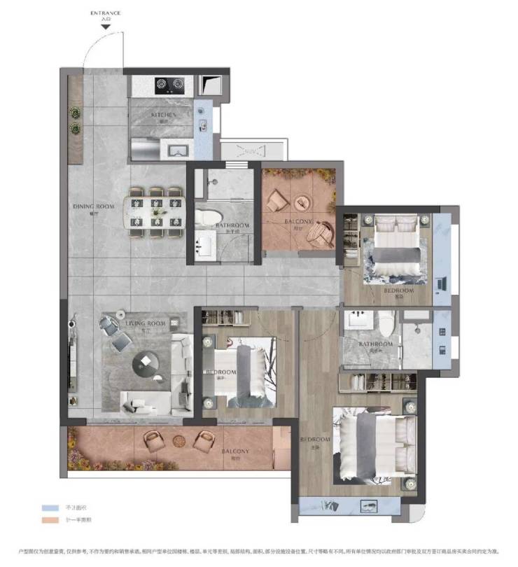 135㎡四房两厅两卫,约7m观景阳台,宽阔视野收藏中轴绿廊。