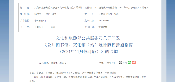 人民网北京11月4日电 (记者刘佳)日前,文化和旅游部印发《公共图书馆、文化馆(站)疫情防控措施指南(2021年11月修订版)的通知》(以下简称《指南》)。