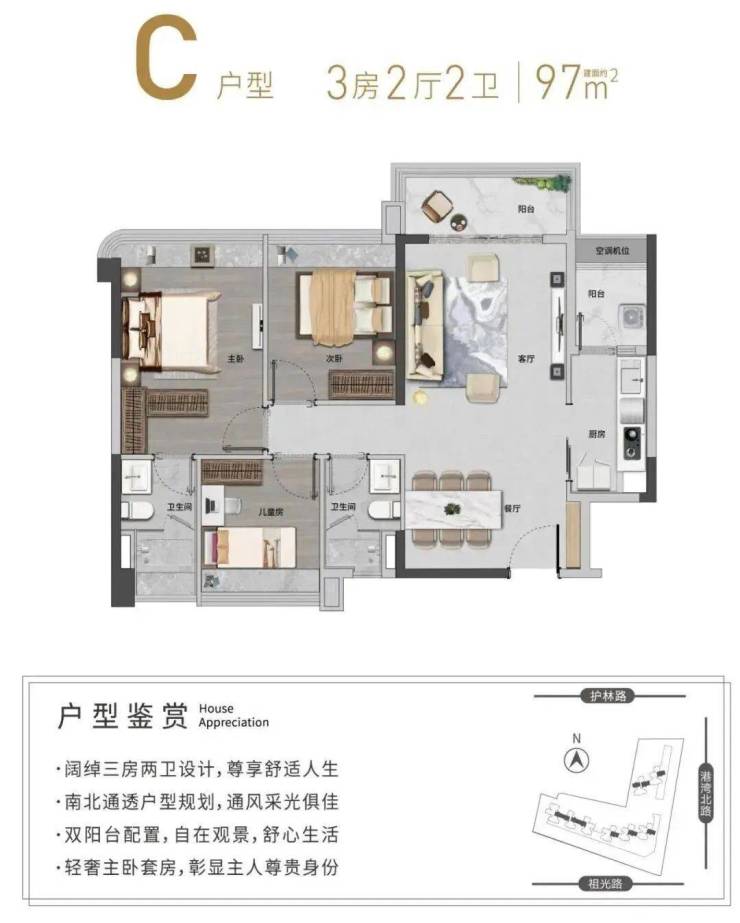 产品建面约86-110㎡三房,全景飘窗设计,尽享开阔观景视野