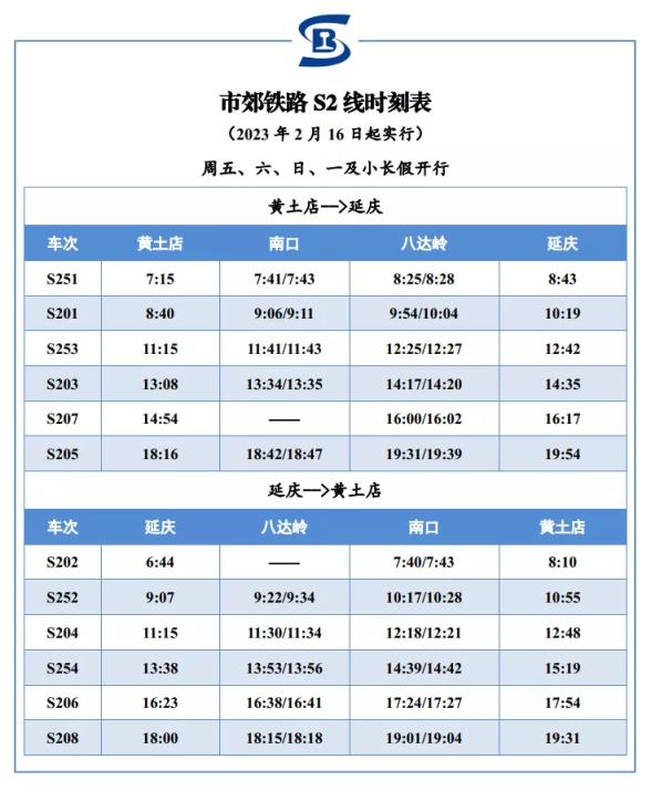 黄土店站开往延庆(沙城)方向列车最早7时15分发车,仅上午时段就有3趟列车可供旅客选择;延庆(沙城)返回黄土店站方向,最早6时44分发车,最晚一趟列车18时发车,可以满足游客一天往返游玩需求。