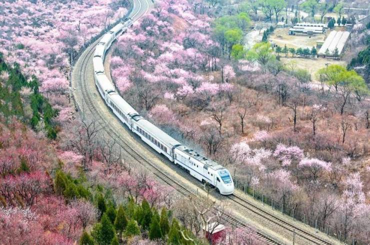 每年春季北京市郊铁路S2线都将迎来一年中最美的时刻,列车蜿蜒行驶在群山之间,漫山遍野分布着粉色的山桃花、浅白色的杏花。S2列车是国内第一条市郊铁路线路,S2线行驶在群山花海之中,蜿蜒前行,被网友亲切地誉为“开往春天的列车”。