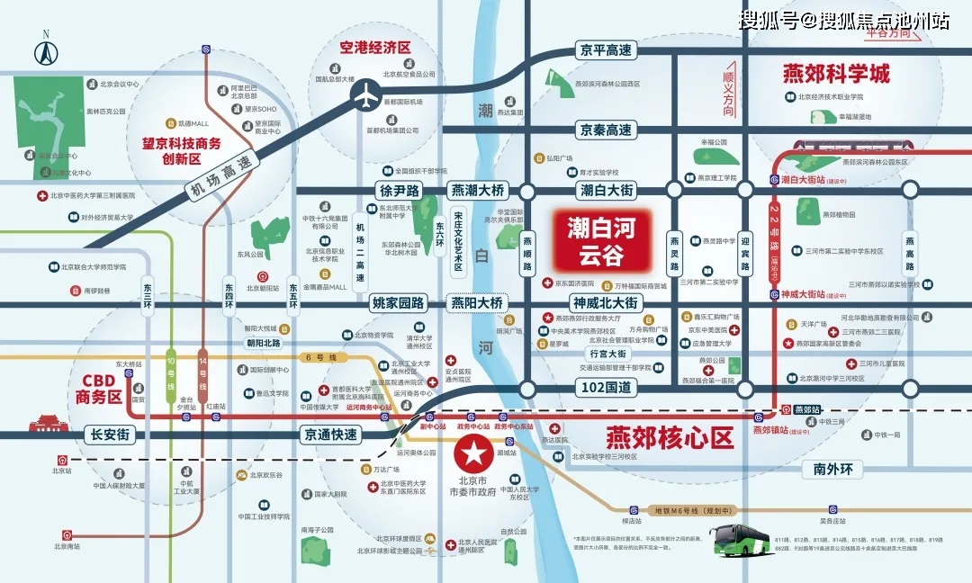 潮白河云谷位于燕郊国家高新区核心区,紧邻燕潮大桥,与通州副中心仅一桥之隔。项目距离通州副中心市委市政府仅10公里;首都国际机场25公里;望京CBD26公里;国贸CBD 30公里,地处首都半小时生活圈内,快速提升商务速率。