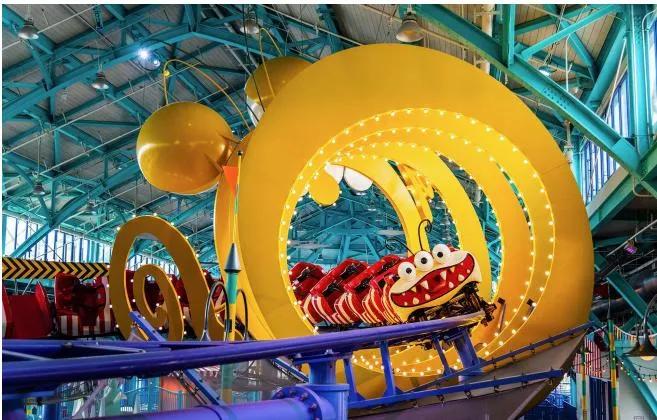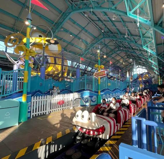 小黄人乐园的萌转过山车是一套亲子同乐的滑行类过山车。我们结合小黄人的动画,设计了一段多重连环转弯的路轨,让游客仿佛穿梭在时空隧道中,重现小黄人的经典场景。其中,安全压杆的细节处理也是这套设备的一大亮点,金马独创的无级锁紧装置,能适应身高0.9米到1.9米、较大体重136公斤的游客;特别增加的扶手装置,既兼顾成人抓握的舒适性,又考虑到小孩体型避免碰头,为此我们做了18000多次反复测试,力求达到较佳效果。