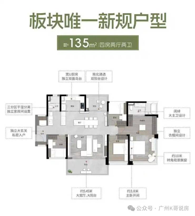 约135㎡户型,四房两厅两卫,南北通透双阳台设计,自带约5.25米大宽厅以及约5.45米大阳台,主卧开间约3.6米,已经快追上不少紧凑三房的客厅开间了!
