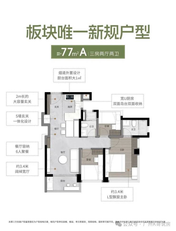 77平A户型,三房两厅两卫;