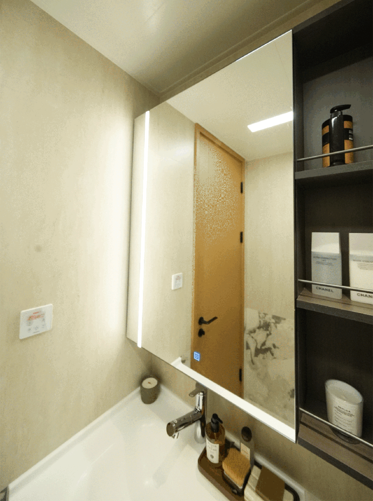 卫生间两扇镜柜门边缘,均与柜壁工整对齐,美观的同时也避免磕碰,非常用心。