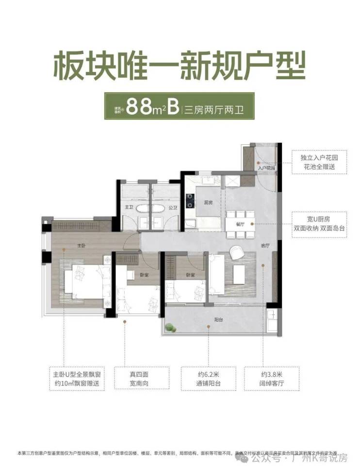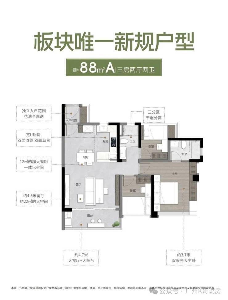 建面约88㎡A户型,三房两厅两卫,有约4.7米大阳台,以及约3.5*4.3米双采光大主卧。