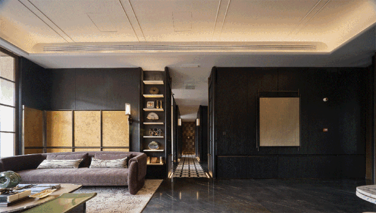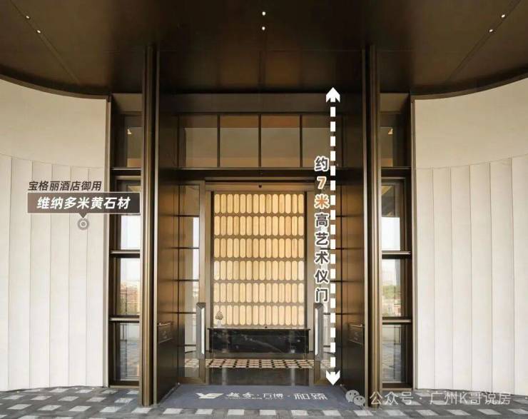 一进大门,整个入户大堂以宝格丽酒店设计风格为灵感,每一个细节都透出映射质感。约7米高的艺术移门辅以奢石弧形墙面,以强烈的仪式感,勾勒通往越秀·万博和臻的“玄关”。