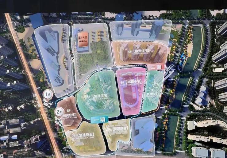 一共规划了7个地块,其中2个复建地块、2个融资地块、2个商业地块+1个学校地块。