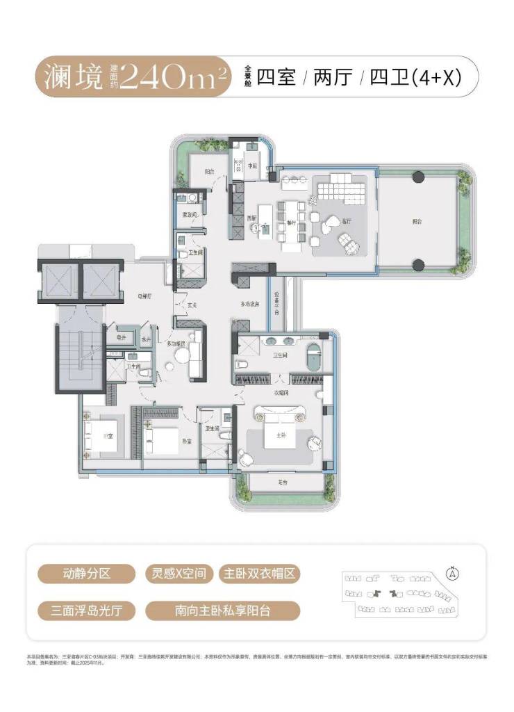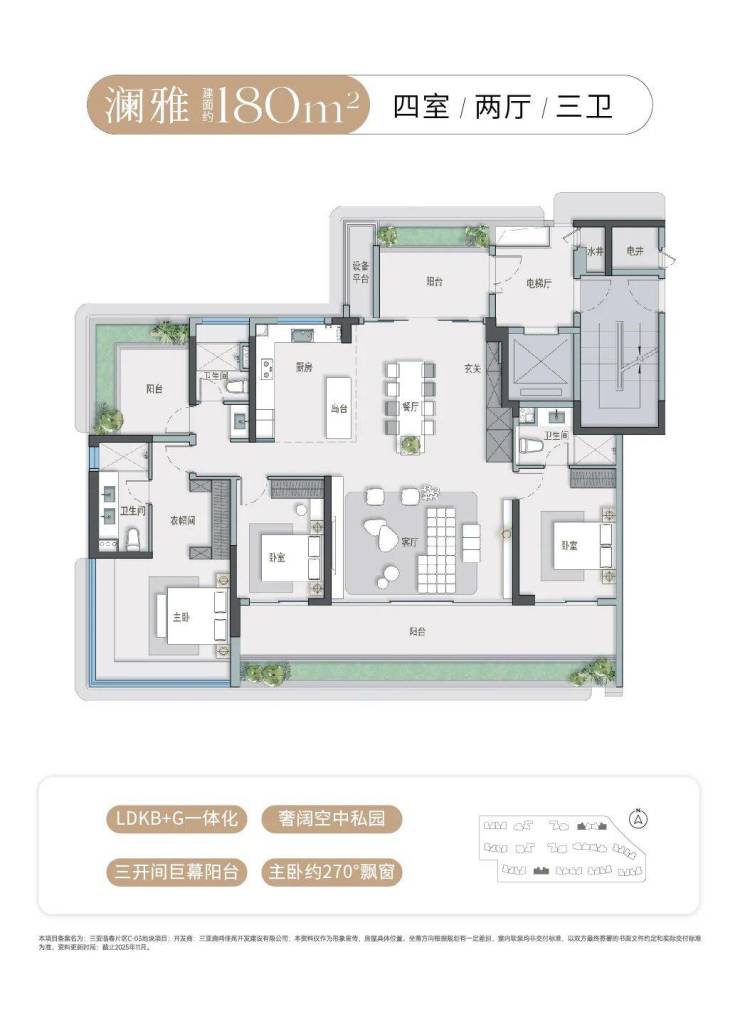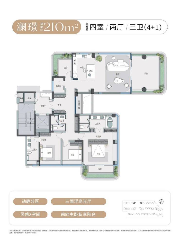 作为项目核心价值亮点,三亚首发的“建面约132-240㎡浮岛全景舱”设计,重新定义了滨海旅居空间标准。依托约2.0低容积率、40%高绿地率的低密社区规划,大部分产品采用LDKB+G一体化、宽幕奢景阳台、多开间朝南等创新设计,部分户型配备270°飘窗、中西双厨及灵动X空间,最大化引入自然光线与景观资源,实现“推窗见绿、凭栏观景”的居住体验,精准适配多代同堂旅居、长期度假栖居等多元需求。
