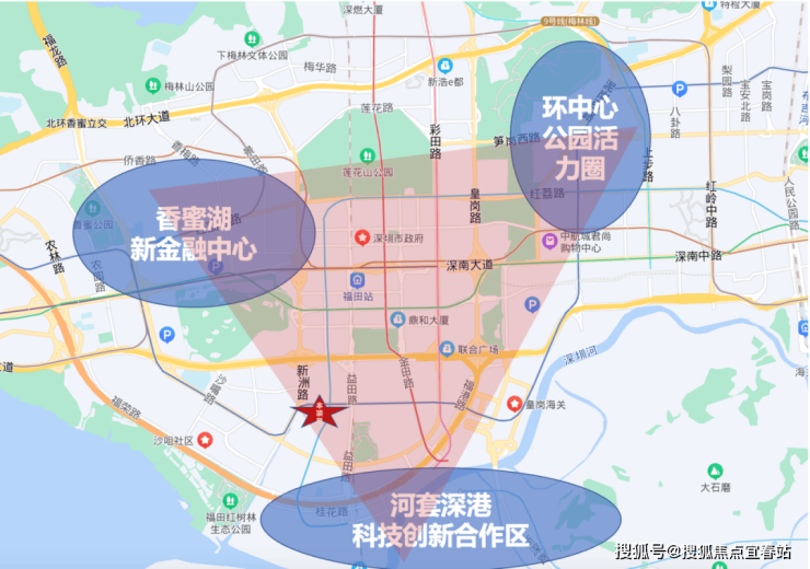 最新“十四五”规划中,福田定位湾区总部经济核心区,并聚焦河套深港科技创新合作区、香蜜湖新金融中心、环中心公园活力圈“三大新引擎”,项目位于三大引擎的三角地带核心位置,坐拥众多规划和资源。