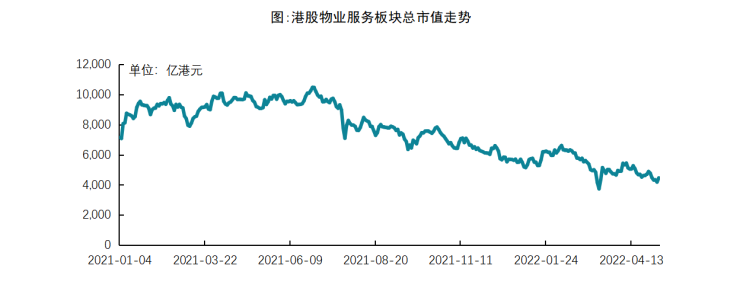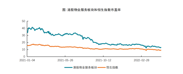 港股物业服务板块总市值进入2021年之后维持高位,6月末突破万亿港元。但受外部环境、关联房地产企业压力传导和前期市场高热度引起的回调需求影响,随后一路下降到4464.9亿港元。市盈率也从年初的41.3倍,下降到13.0倍,但仍高于恒生指数9.1倍的整体水平。将港股物业服务板块市场表现与历史比较可以发现,其总市值与2020年8月相当,而市盈率回到2018年11月水平。