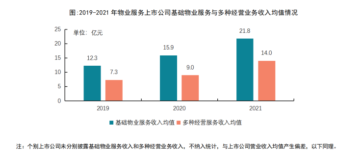 上市公司收入主体仍然是基础物业服务,多种经营日益成为拓展利润空间的重要赛道。2021年上市公司基础物业服务收入均值为21.8亿元,同比增长37.0%,多种经营收入均值14.0亿元,同比大幅增长55.5%。其中,社区增值服务实现了跨越式增长,主要集中在社区生活服务、房产经纪、社区零售、家装服务等领域。从服务空间延伸角度,上市公司则走出社区,走进城市广阔空间。