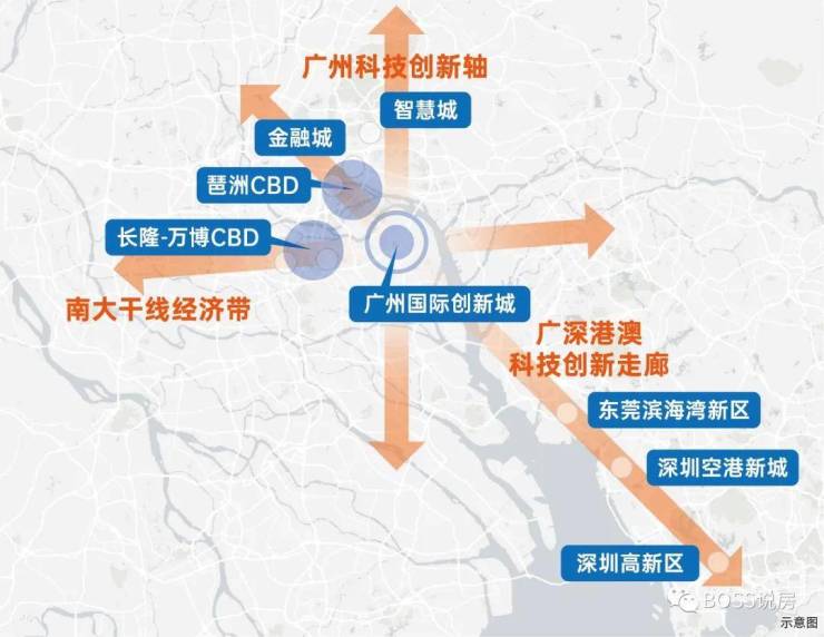广州科技创新轴——广州施行“东进、南拓”发展战略,城市重心向东南移动。以中新知识城和南沙科学城为极点,落位国际创新城,汇聚国际一流人才资源、科技基础设施、高等院校、科研机构和科技型企业,如思科、韩国LS、探迹、小鹏汇天、广汽埃安等头部独角兽企业已相继进驻,带动第三中轴科技创新产业发展,未来产值将超万亿GDP。(数据来源:广州日报)