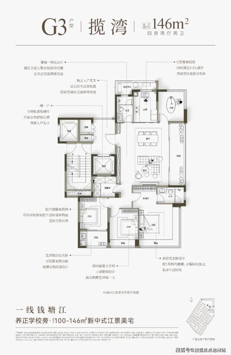 建面约146平方米的户型为四房设计。内有两种格局,一种为四开间三卧室朝南,南北三阳台,还有一个大横厅。另一种为大边厅设计,主卧是L形设计,阳光轻松入户。这两种设计都是为了能让大部分房源在室内一览钱塘江的风景。