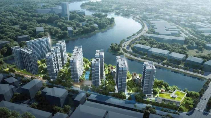 户型排布从石榴岗河自东向西依次升高,保证了约300米宽的生态水景面。
