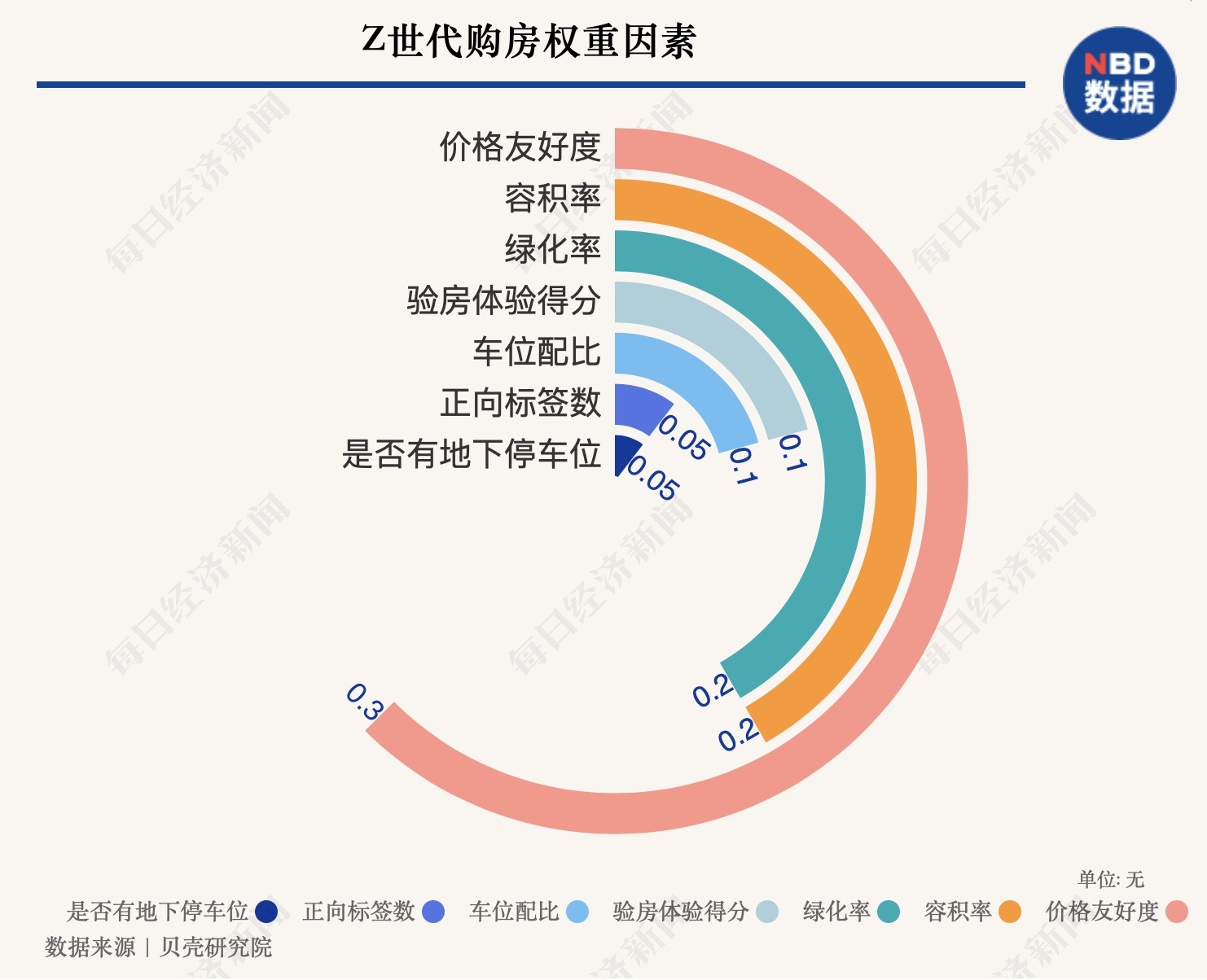 贝壳研究院高级分析师闫金强告诉《每日经济新闻》记者:“这些楼盘因素的权重是按专家评分法确定的,同时参考了熵权法,其中,考虑到Z世代多为刚需,对价格更敏感,所以我们对价格的权重设置较高,为30%。”