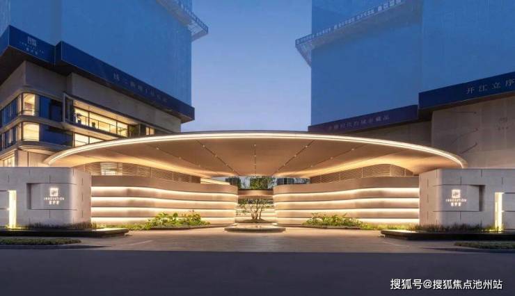 主出入口大门定位于楼盘西北方,从宜秀弄进入,通过「沧浪华盖」造型的大门,绕经「天光云廊」门厅进入地下车库,地下车库中设置「黄金树」连接地下会所和中央车站。