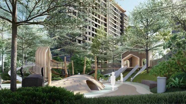 社区核心的中庭区域,利用栈桥,实现一层变两层的廊架方案,达到社区内双层联通的效果,同时完美解决了核心区与社区的高差。富有山地特色的生活场景–穿林过水,依山就势,立体化的核心花园得以美美地呈现。