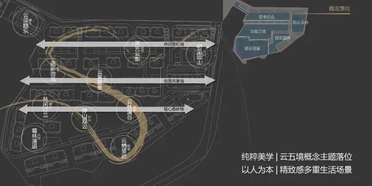 以三条景观归家轴线(休闲放松轴、邻里共享轴、核心森林轴)、五个云中之境(初入云林、登云望林、观云流溪、云庭之境、隐享云山)、十个精致生活花园(初见云山、云林溪谷、云栖望远、伴山观云、林闲汀兰、晴林漫道、疏影微风、云雾雅集、天光云影、云深隐乐)为整体园林布局,构建精致感多重生活场景。同时以三级绿廊步道(快速归家动线、景观归家动线、场地游园小径)串联整个园区,景观节点延步道分散排布,做到楼楼是核心,栋栋有花园。设计亮点