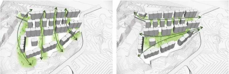 合生缦云·帝景山庄最大的设计难点在于场地的高差,用地高差最高点标高为65米,最低点标高为38米,高差为27米。设计充分利用地块的特性关系,根据地形变化的舒缓,分成了3阶台地空间,将居住空间形成组团形态,并形成了错落有序的天际线变化。