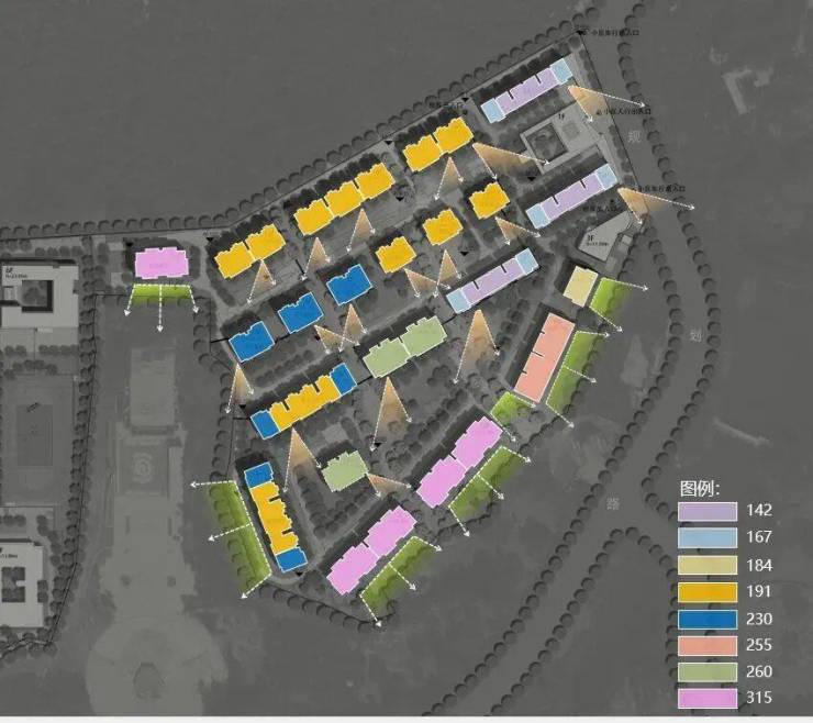出入口正对中央景观,东南侧则设置次要出入口与幼儿园出入口,以不同的高度差分隔各个流线,使其不会相互交错,造成交通组织混乱。