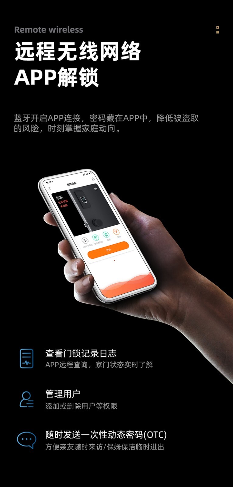 此外,在远程控制技术方面,一些静脉识别锁充分发挥自身的创新优势,做到“想客户之所想”,可以授予访客解锁权限,无需提前录入生物识别特征,也可以快速完成解锁环节,既安全、又便捷。用户也可以借助手机APP,实时查看静脉识别锁的剩余电量,并提前做好相应准备,避免出现低电量强制关机的“尴尬场景”。