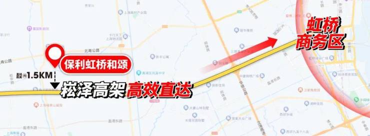 保利虹桥和颂直线距离崧泽高架仅约1.5公里,上高架后没有红绿灯直通大虹桥核心。