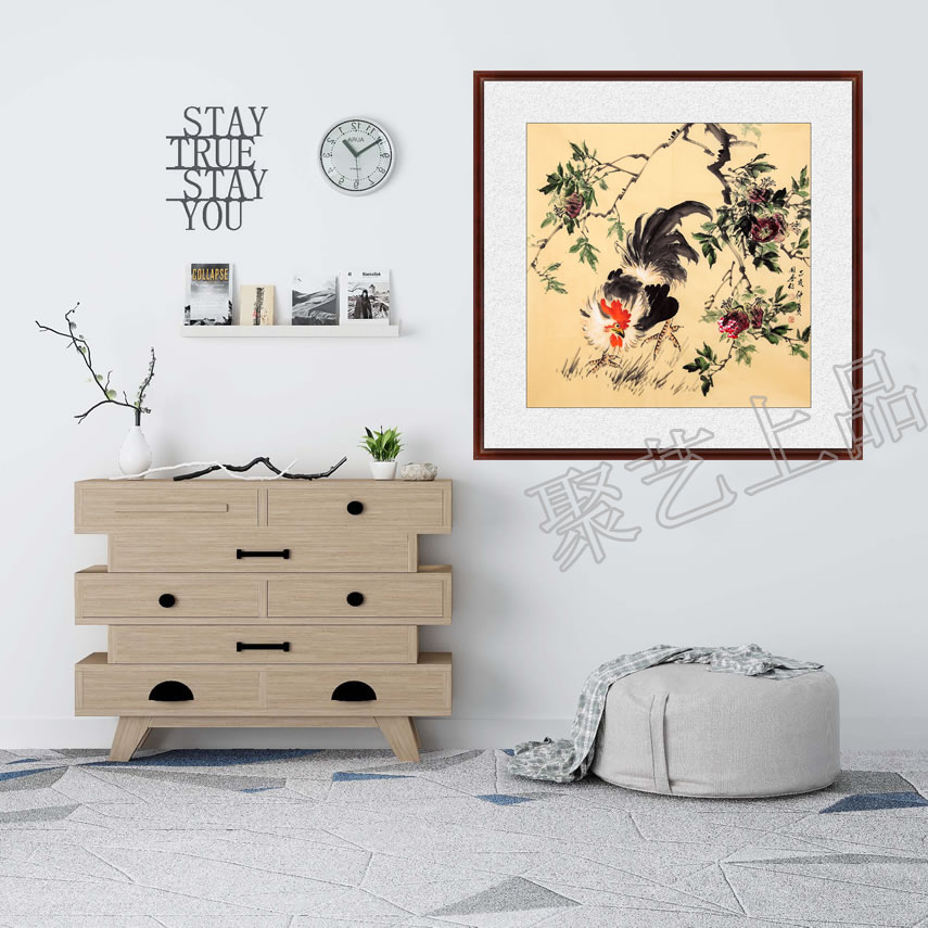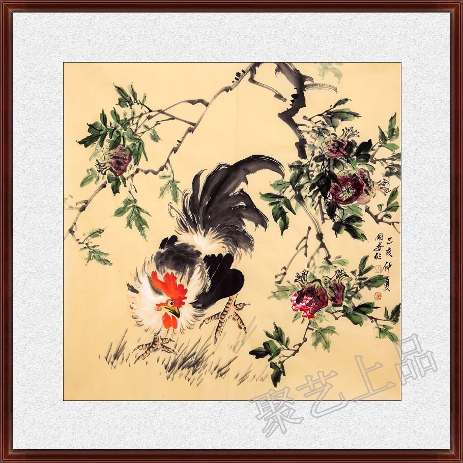 许国安老师的国画石榴公鸡图《仲夏》,鸡”与“吉”谐音,象征吉祥如意、百事大吉、万事如意,国画石榴是富贵、吉祥、繁荣的象征。此幅作品这两者吉祥物相互结合,寓意美好,具有较高的装饰价值,也是礼品字画的佳选!