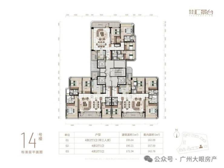 项目由14栋12层小高层组成,产品涵盖123-352㎡三至五房,共8类户型,户型实用率约82-84%