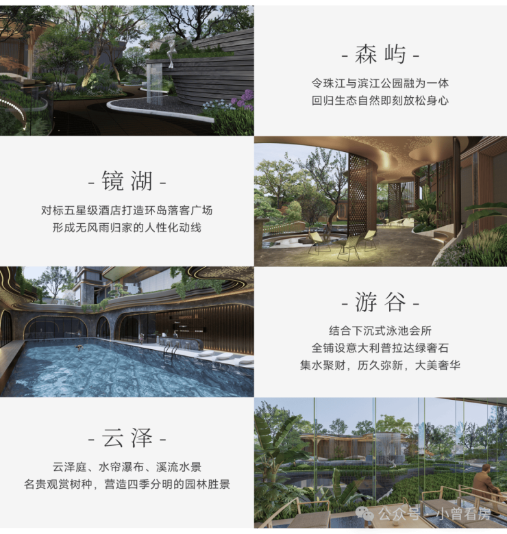 蓝调国际大师主笔,“溯源”广州在地文化,以珠江为源头,溯流而上,从外到内匠心打造:森屿、镜湖、游谷、云泽“四重景观礼序”,塑造优雅归家动线。