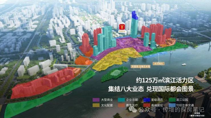8大业态城市综合体,规划有大型商业,企业总部,星级酒店,滨江公园,文化艺术中心,教育医疗配套,高端居住及TOD立体交通于一体。