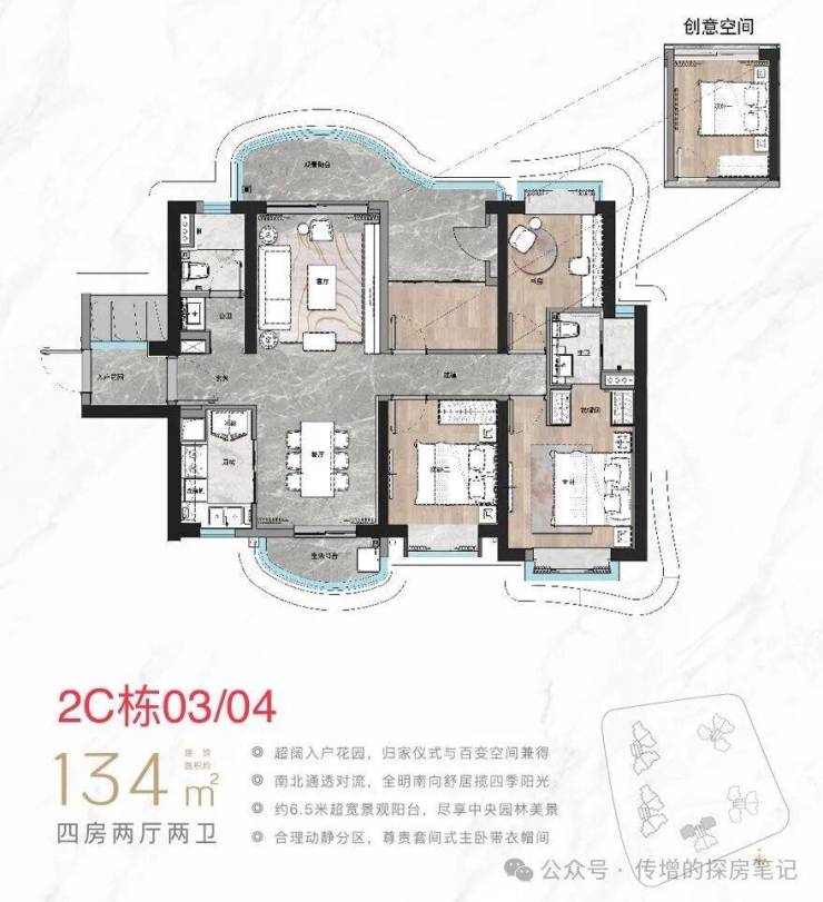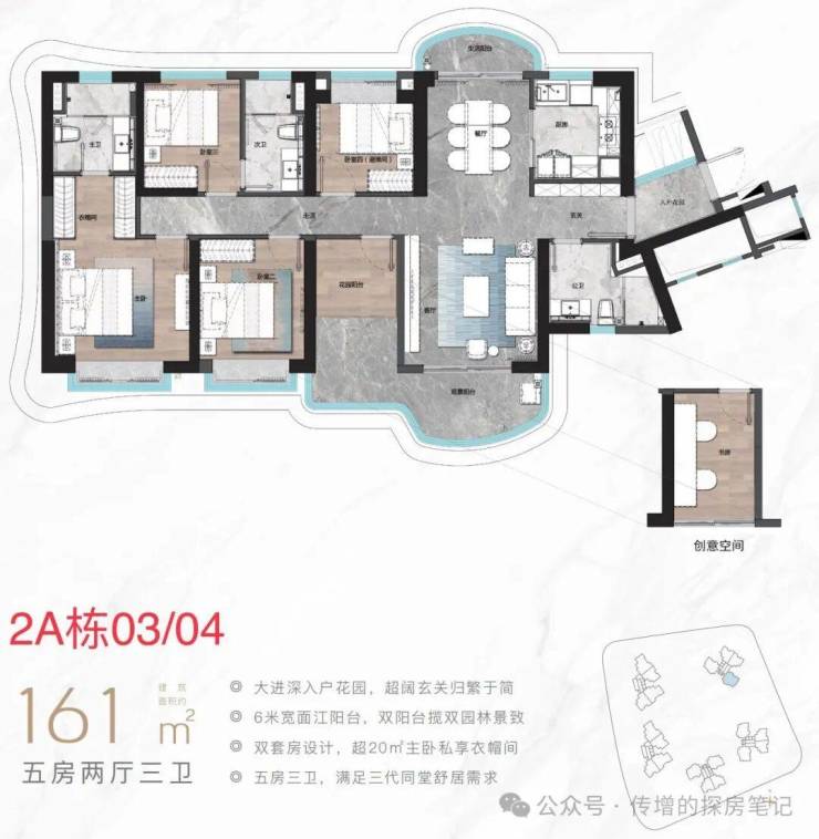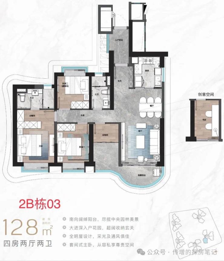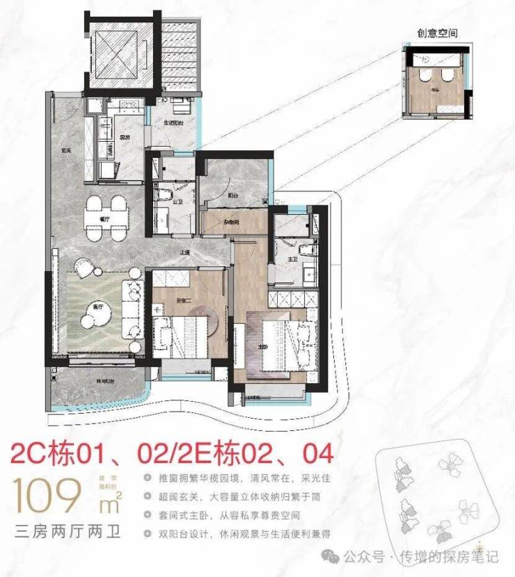 6.设计亮点:项目引入了国际知名的Well健康建筑标准,选用了绿色环保的建筑材料,并安装了3M净水系统、新风系统等先进设施,旨在打造健康舒适的居住环境。
