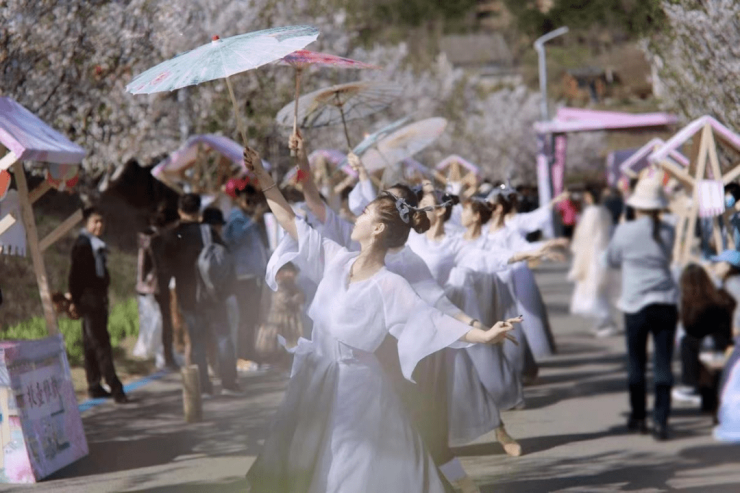 由朵民洋姐等社群主理人,制作水墨樱花团扇、国风纸伞、古韵书签,樱花缤纷之际,带领小镇的客人绘一幅水墨樱花小品,用画笔描绘美好樱花时光。