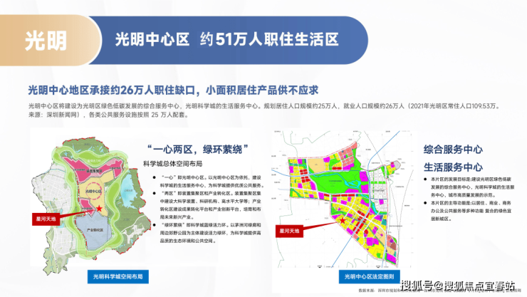 2020年6月9日深圳市规划和自然资源局发布《光明科学城规划刚要》中,规划“一心两区,绿环萦绕”的科学城总体空间布局,以光明中心区为依托,建设科学城的生活服务中心